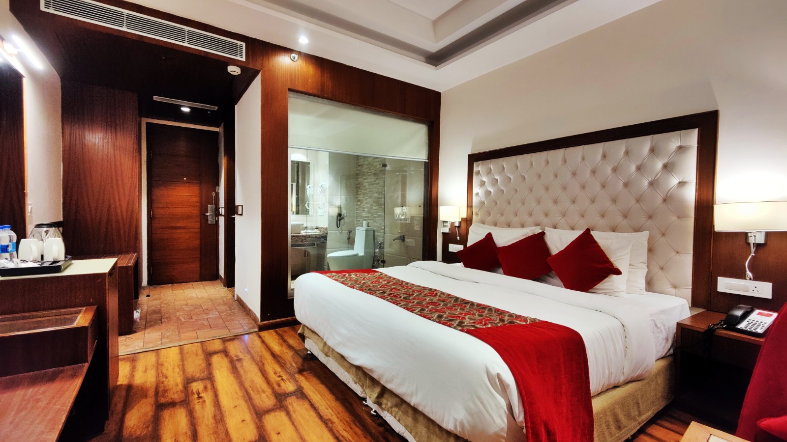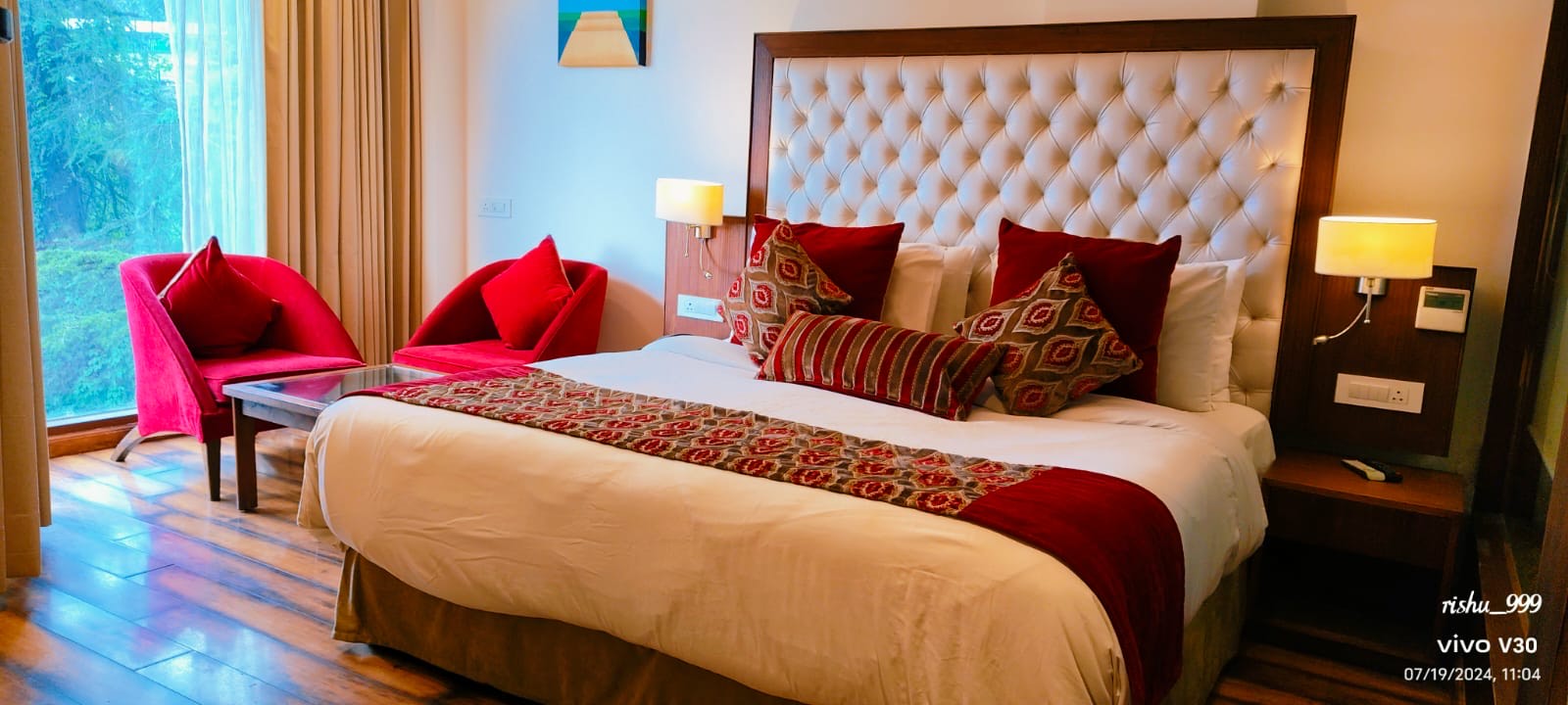 This luxurious room boasts a comfortable layout. Is spacious and elegantly designed in warm colours with all modern amenities. The expansive windows open to spectacular views of the Deodar forests.
